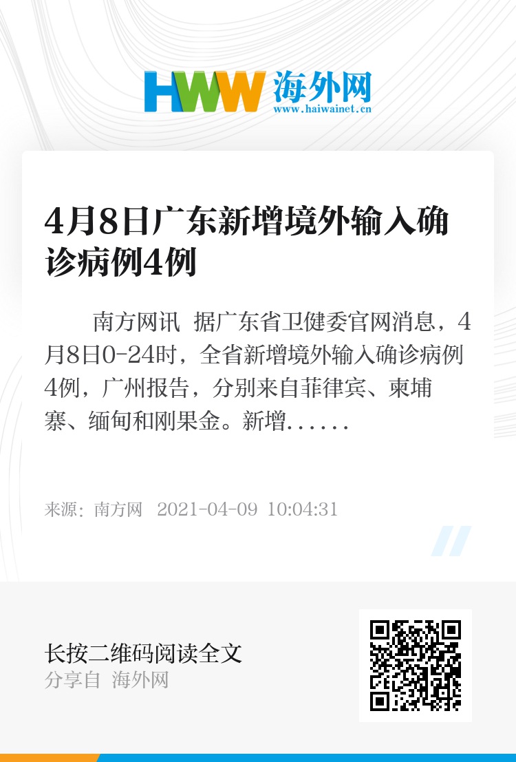南方网讯 据广东省卫健委官网消息,4月8日0-24时,全省新增境外输入确诊病例4例,广州报告,分别来自菲律宾、柬埔寨、缅甸和刚果金。新增境外输入无症状感染者3例,广州报告,分别来自马来西亚、菲律宾和阿曼。新增出院3例。