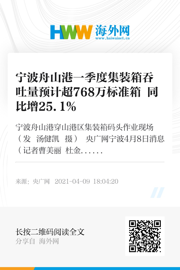 央广网宁波4月8日消息(记者曹美丽 杜金明 通讯员洪宇翔 景鹏飞)宁波舟山港4月8日生产快报显示,宁波舟山港一季度预计完成集装箱吞吐量768.9万标准箱,同比增长25.1%。