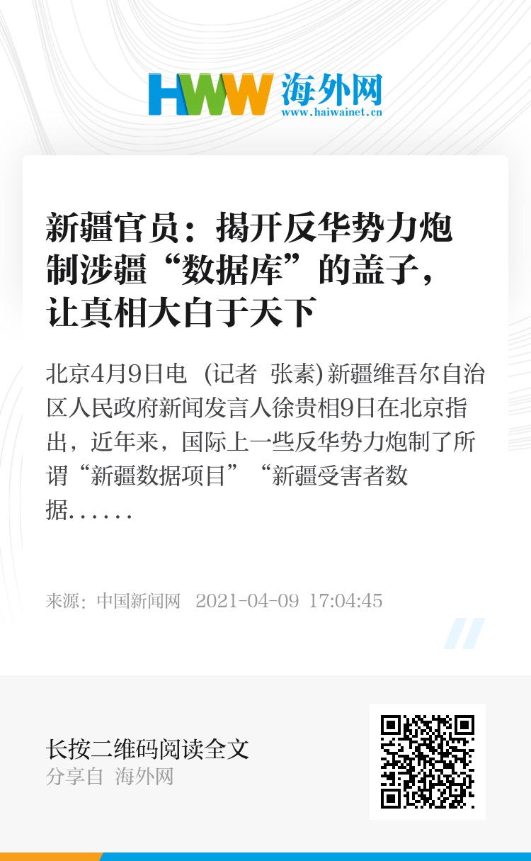 “今天,我们在此举办涉疆问题新闻发布会,就是要揭开这些‘数据库’的盖子,一起看看有关机构和人员的真实情况,让真相大白于天下。”