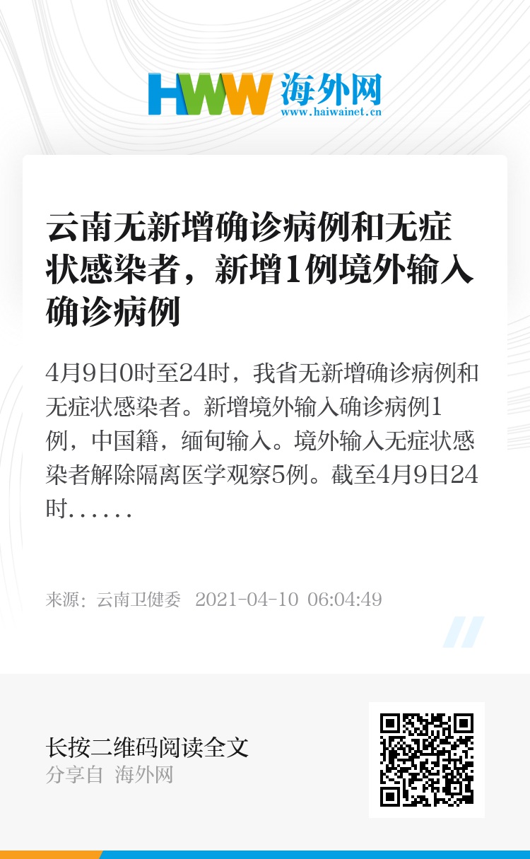 4月9日0时至24时,我省无新增确诊病例和无症状感染者。新增境外输入确诊病例1例,中国籍,缅甸输入。境外输入无症状感染者解除隔离医学观察5例。