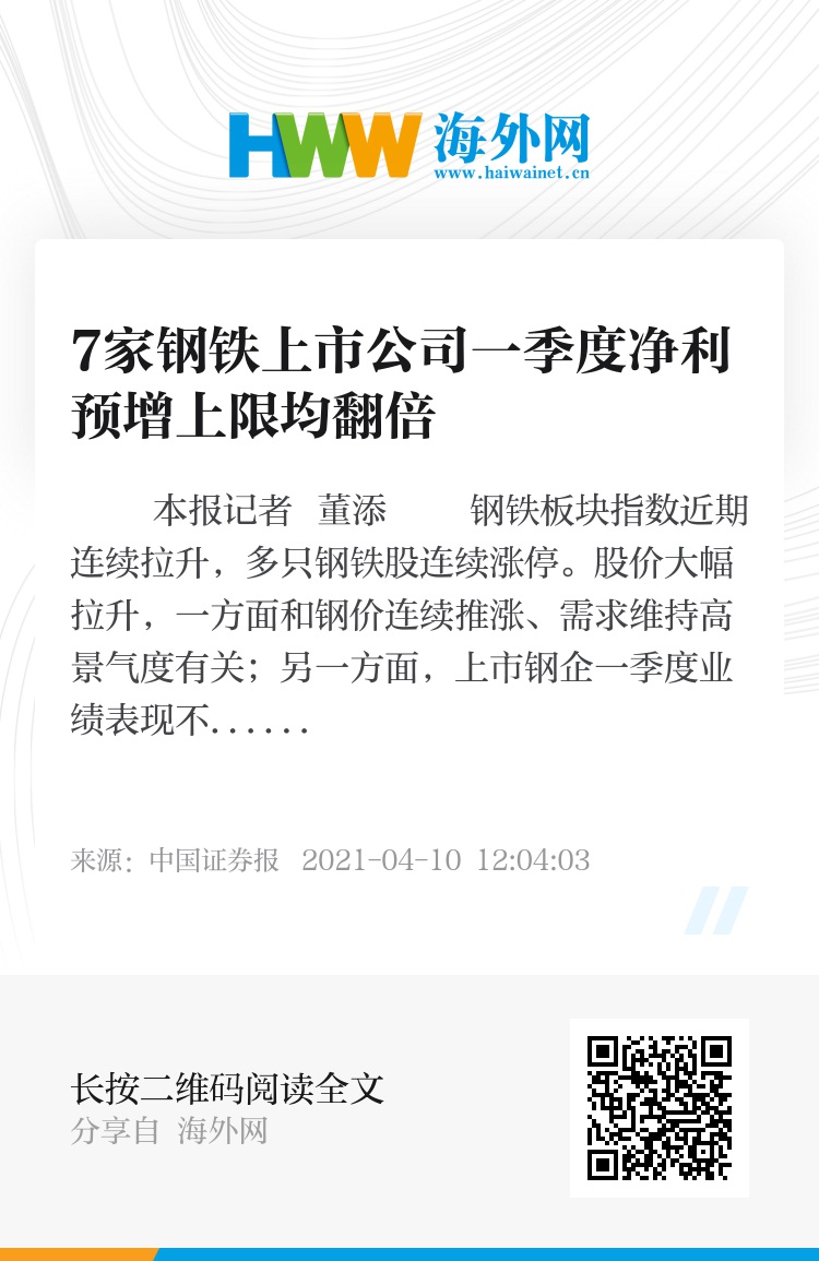 一季度业绩预告方面,截至4月9日晚,A股共有7家钢铁上市公司对外披露一季度业绩预告,全部预喜,且净利润同比增长幅度上限全部超过100%。