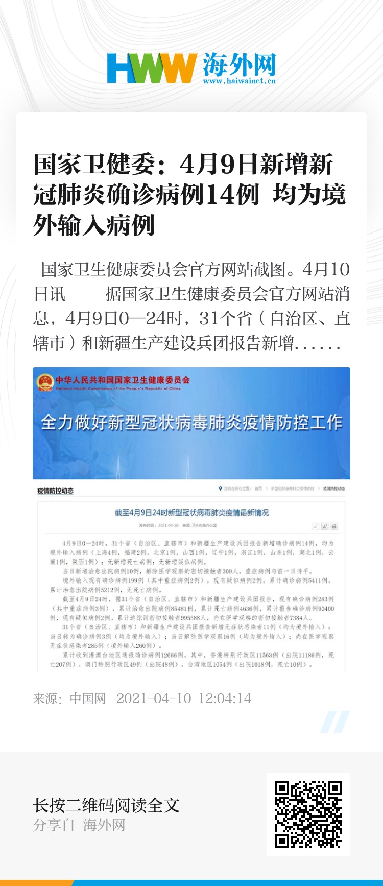 中国网4月10日讯 据国家卫生健康委员会官方网站消息,4月9日0—24时,31个省(自治区、直辖市)和新疆生产建设兵团报告新增确诊病例14例,均为境外输入病例(上海4例,福建2例,北京1例,山西1例,辽宁1例,浙江1例,山东1例,湖北1例,云南1例,陕西1例);无新增死亡病例;无新增疑似病例。