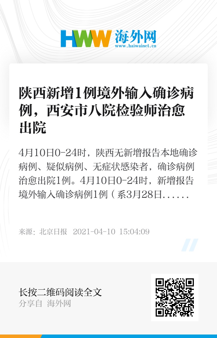 4月10日0-24时,陕西无新增报告本地确诊病例、疑似病例、无症状感染者,确诊病例治愈出院1例。