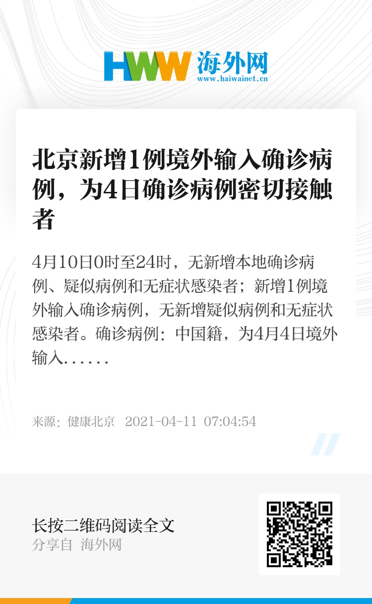 确诊病例:中国籍,为4月4日境外输入确诊病例的密切接触者。4月2日从瑞典出发,4月3日到达北京首都机场,海关经健康筛查并进行核酸检测后,经闭环管理送至集中隔离酒店。4月9日核酸检测结果为阳性,转至定点医院,综合流行病史、临床表现、实验室检测和影像学检查等结果,4月10日诊断为确诊病例,临床分型为普通型。