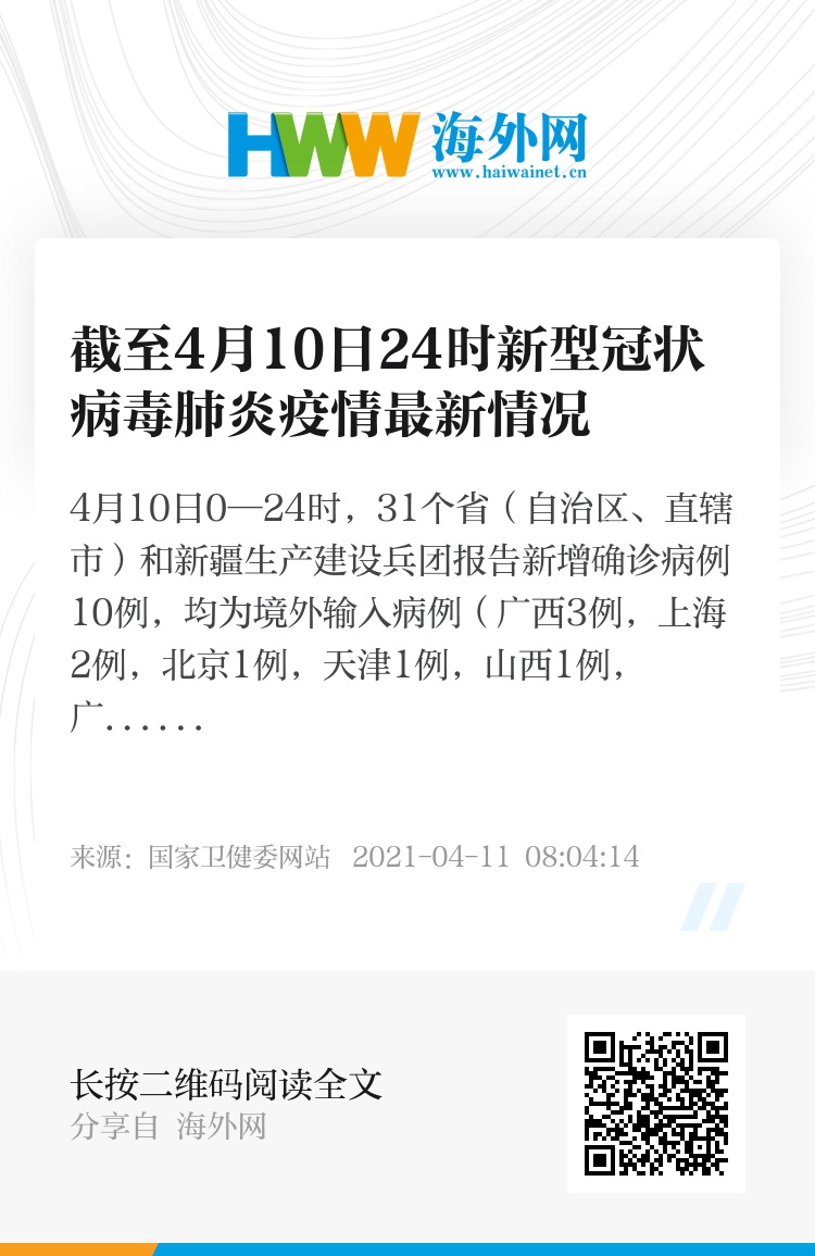 4月10日0—24时,31个省(自治区、直辖市)和新疆生产建设兵团报告新增确诊病例10例,均为境外输入病例(广西3例,上海2例,北京1例,天津1例,山西1例,广东1例,四川1例);无新增死亡病例;无新增疑似病例。