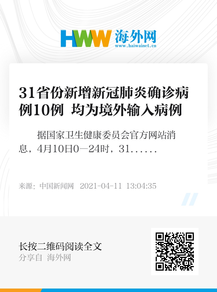 据国家卫生健康委员会官方网站消息,4月10日0―24时,31个省(自治区、直辖市)和新疆生产建设兵团报告新增确诊病例10例,均为境外输入病例(广西3例,上海2例,北京1例,天津1例,山西1例,广东1例,四川1例);无新增死亡病例;无新增疑似病例。