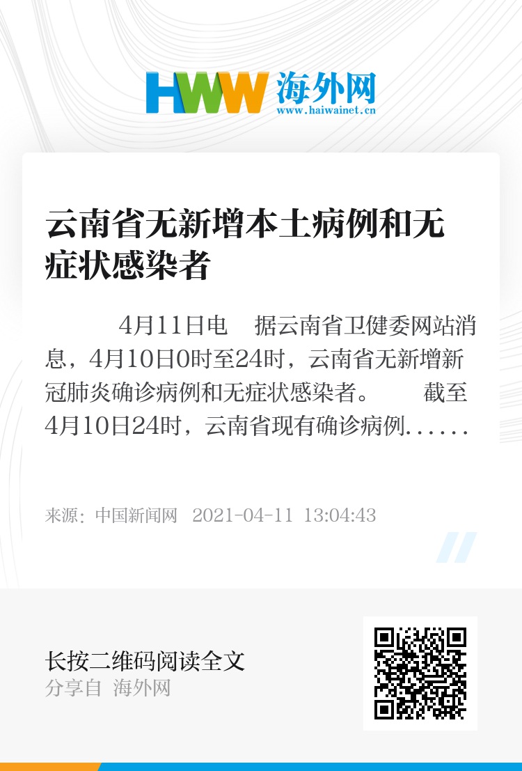 中新网4月11日电 据云南省卫健委网站消息,4月10日0时至24时,云南省无新增新冠肺炎确诊病例和无症状感染者。