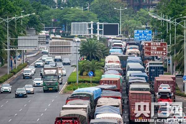2021年4月3日,出岛车辆剧增导致海口丘海大道十分拥堵(央广网记者 洪坚鹏 摄)