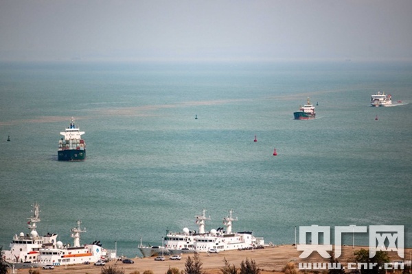2021年4月3日,进出秀英港的滚装船舶(央广网记者 洪坚鹏 摄)