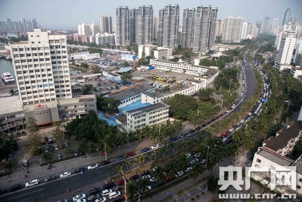 2018年2月19日,海口市滨海大道上滞留的车辆(央广网记者 洪坚鹏 摄)