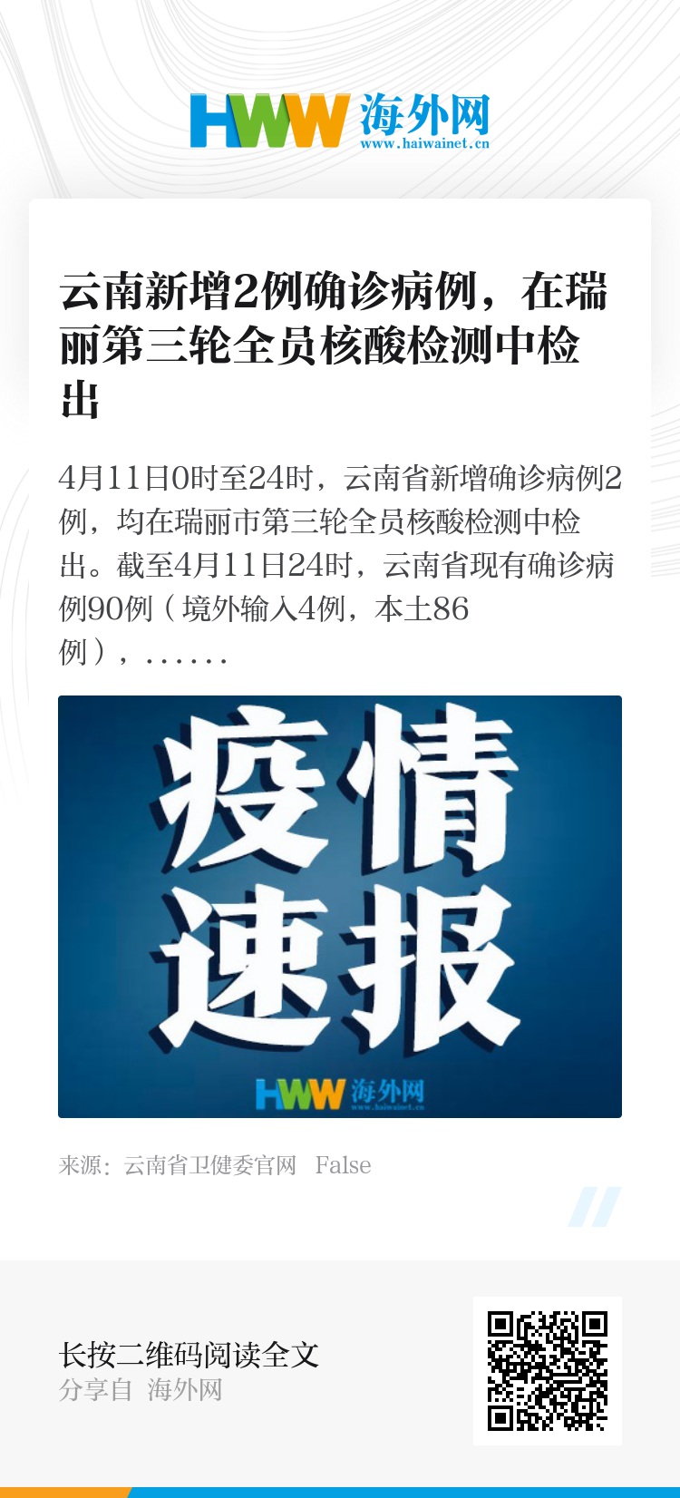 4月11日0时至24时,云南省新增确诊病例2例,均在瑞丽市第三轮全员核酸检测中检出。