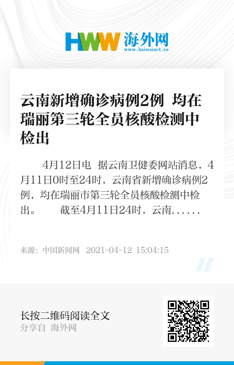 中新网4月12日电 据云南卫健委网站消息,4月11日0时至24时,云南省新增确诊病例2例,均在瑞丽市第三轮全员核酸检测中检出。