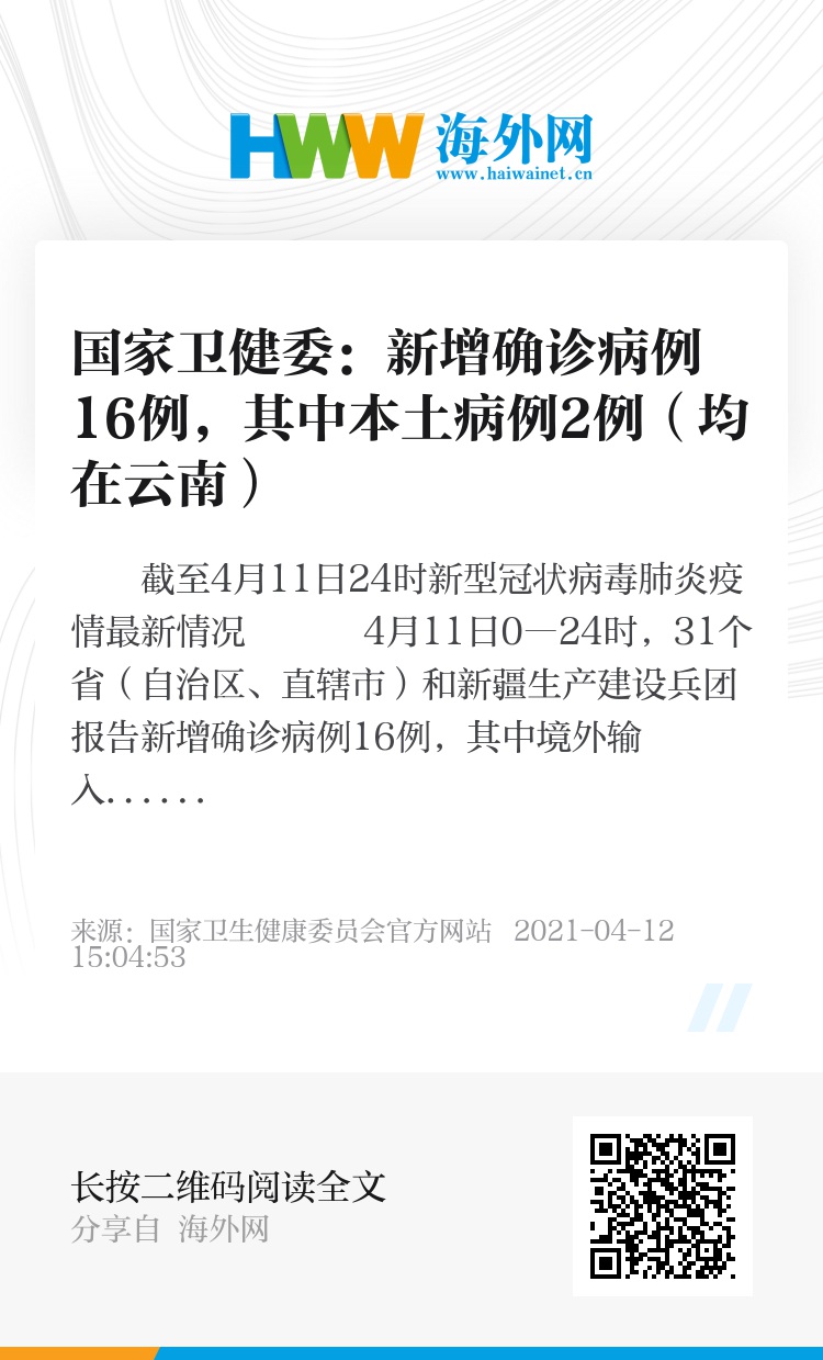 4月11日0―24时,31个省(自治区、直辖市)和新疆生产建设兵团报告新增确诊病例16例,其中境外输入病例14例(福建4例,上海3例,广东3例,陕西2例,北京1例,山东1例),本土病例2例(均在云南);无新增死亡病例;新增疑似病例1例,为境外输入病例(在上海)。