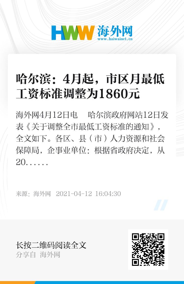 海外网4月12日电 哈尔滨政府网站12日发表《关于调整全市最低工资标准的通知》,全文如下。