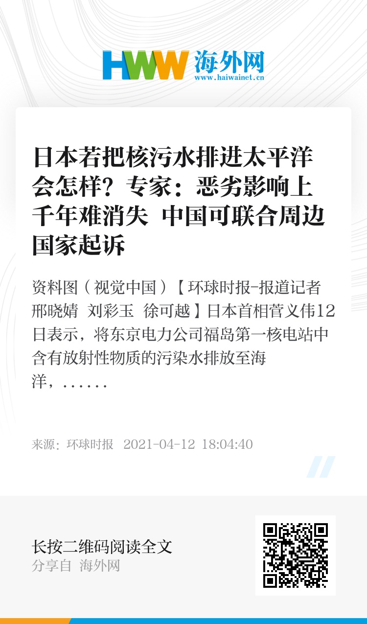 【环球时报-环球网报道记者 邢晓婧 刘彩玉 徐可越】日本首相菅义伟12日表示,将东京电力公司福岛第一核电站中含有放射性物质的污染水排放至海洋,对于复兴福岛来说“不可避免”“刻不容缓”。虽然尚未正式作出决定,此举已遭到来自日本国内外的强烈反对。中国外交部发言人赵立坚12日表示,中方已通过外交渠道向日方表明严重关切,要求日方切实以负责任的态度,审慎对待福岛核电站核废水处置问题。
