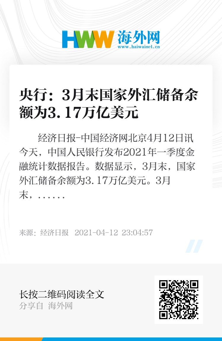 经济日报-中国经济网北京4月12日讯 今天,中国人民银行发布2021年一季度金融统计数据报告。数据显示,3月末,国家外汇储备余额为3.17万亿美元。3月末,人民币汇率为1美元兑6.5713元人民币。