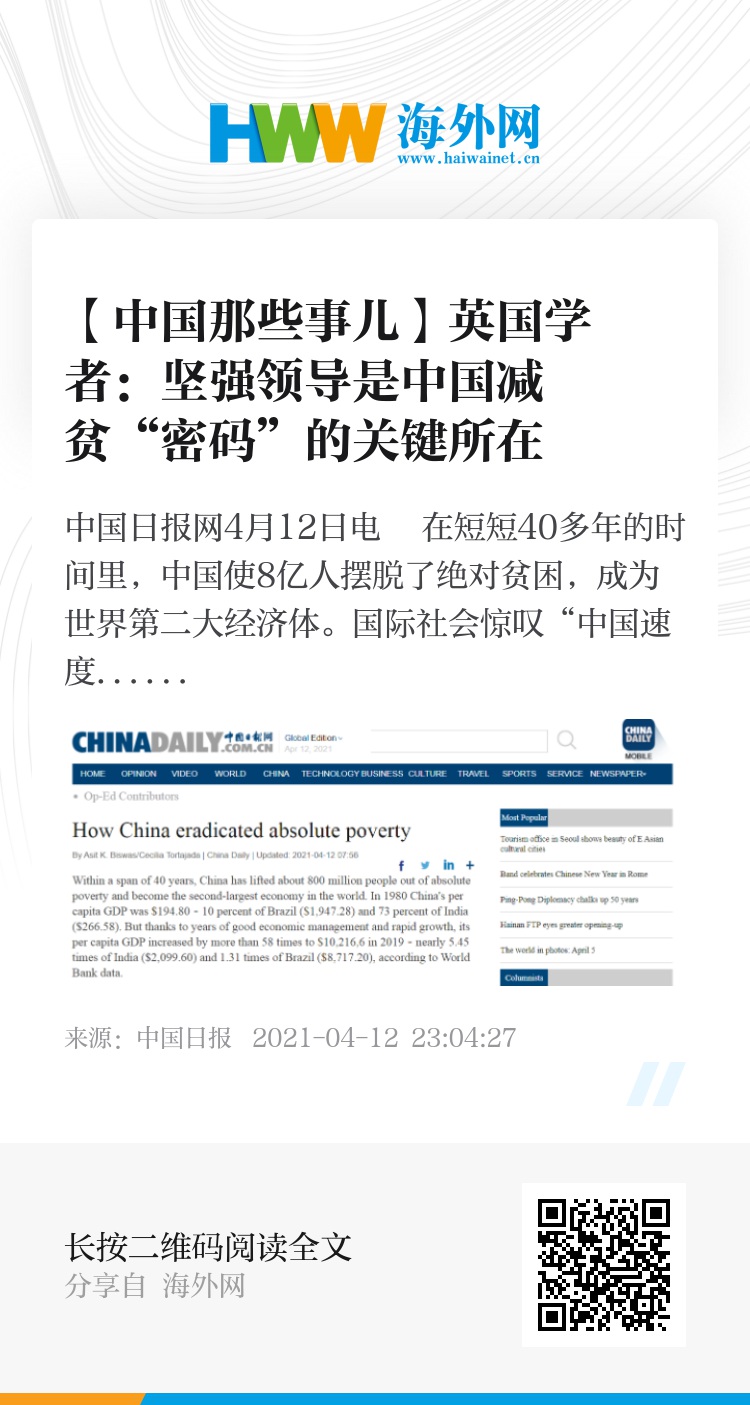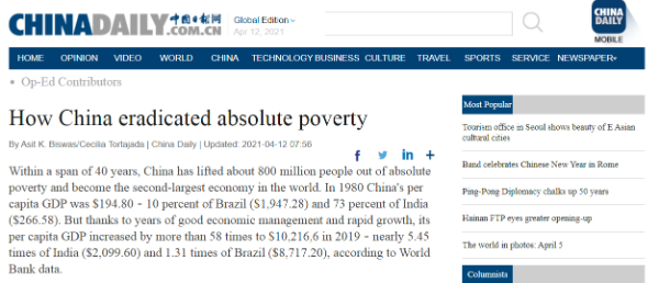 近日,英国格拉斯哥大学杰出访问教授阿西特•比斯瓦斯(Asit K. Biswas)、跨学科研究学院教授塞西莉亚•托塔哈达(Cecilia Tortajada)在《中国日报》发表文章总结了中国脱贫奇迹的六大密码,认为坚强领导是中国减贫“密码”的关键所在。