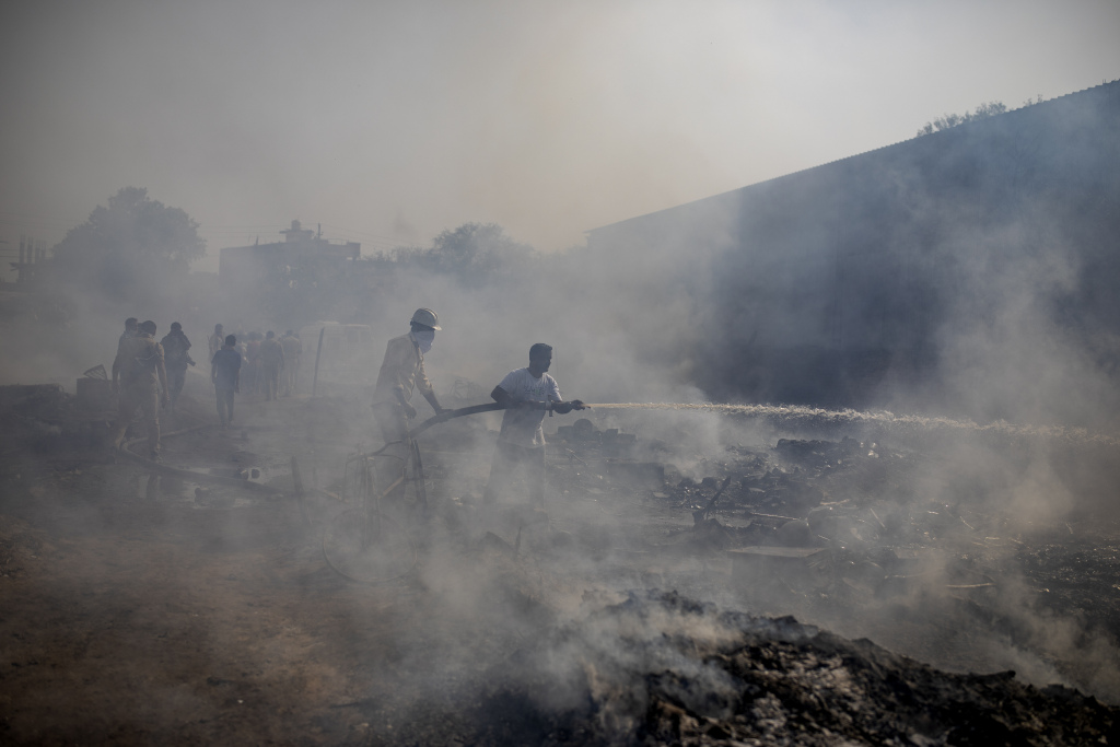 当地时间2021年4月11日,印度新德里郊区,贫民窟发生火灾,造成2名儿童死亡,超过150间房屋被烧毁。图片来源:澎湃影像