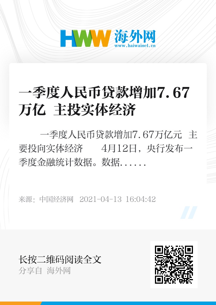 一季度人民币贷款增加7.67万亿元 主要投向实体经济