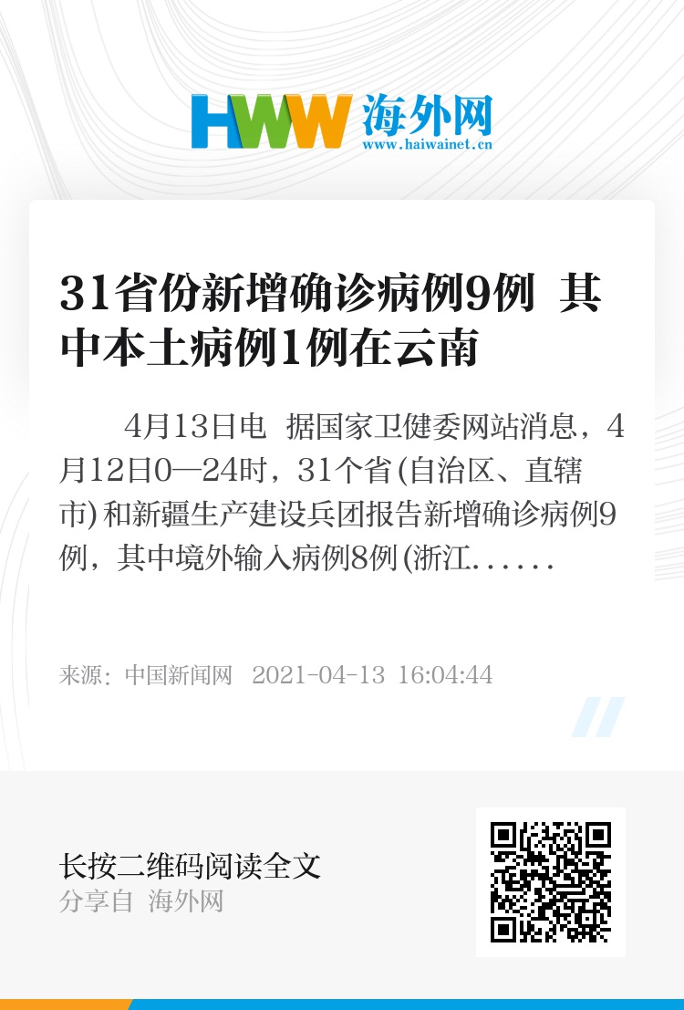 中新网4月13日电 据国家卫健委网站消息,4月12日0—24时,31个省(自治区、直辖市)和新疆生产建设兵团报告新增确诊病例9例,其中境外输入病例8例(浙江2例,广东2例,四川2例,上海1例,福建1例),本土病例1例(在云南);无新增死亡病例;无新增疑似病例。