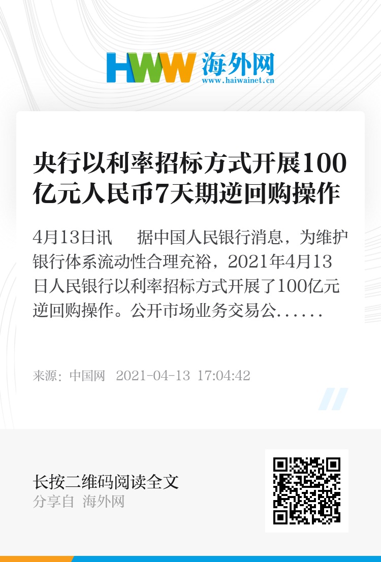 中国网4月13日讯 据中国人民银行消息,为维护银行体系流动性合理充裕,2021年4月13日人民银行以利率招标方式开展了100亿元逆回购操作。
