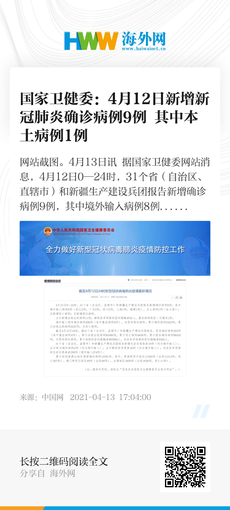 中国网4月13日讯 据国家卫健委网站消息,4月12日0—24时,31个省(自治区、直辖市)和新疆生产建设兵团报告新增确诊病例9例,其中境外输入病例8例(浙江2例,广东2例,四川2例,上海1例,福建1例),本土病例1例(在云南);无新增死亡病例;无新增疑似病例。
