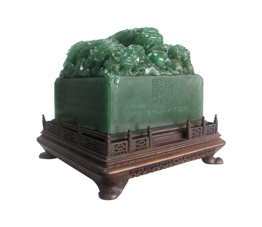 油绿色东陵玉石,色泽艳丽、质地致密坚韧,拥有如此色彩和质地的大尺寸东陵玉石在自然界中并不多见,用这样的材质制成一方大印更是存在一定难度。