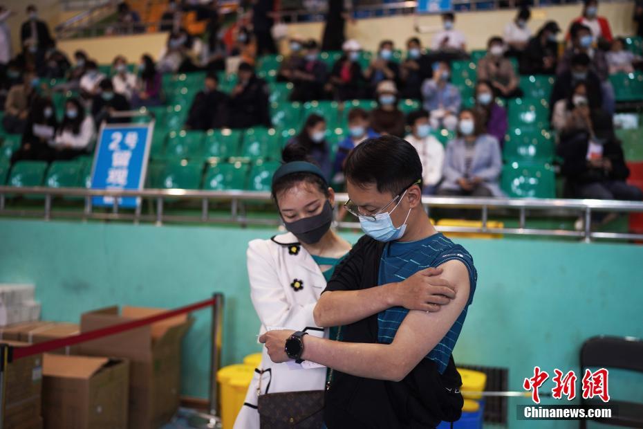 4月12日,云南昆明,一名男子注射完疫苗后在阅读注意事项。 中新社记者 康平 摄