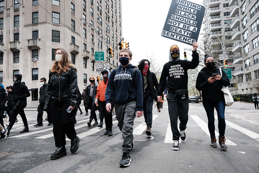 当地时间2021年4月12日,美国纽约爆发抗议示威活动,数百名抗议者喊着莱特的名字,要求司法公正,现场与警方对峙。美国媒体12日报道,明尼苏达州布鲁克林中心市一名非裔男子11日在驾车途中被警察拦下,并在交涉过程中遭警察开枪随后死亡。此事件引发多地抗议示威。图片来源:人民视觉