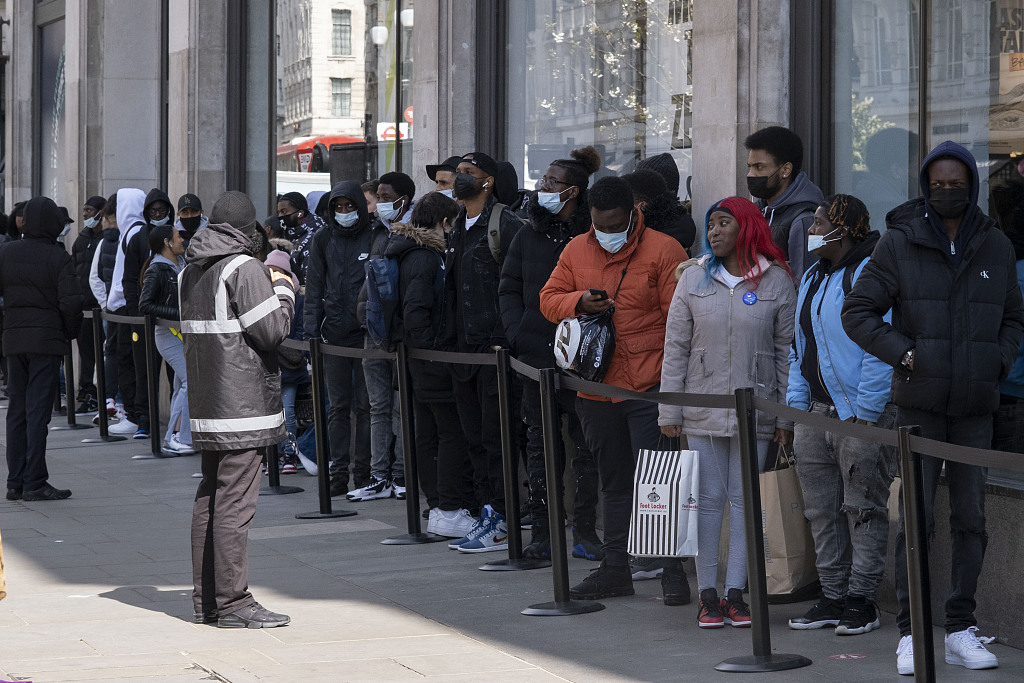 当地时间2021年4月12日,英国政府进一步放宽英格兰地区为防控新冠疫情而实施的“禁足”措施,不少零售店铺恢复营业,店外出现排队现象。按照英国政府此前发布的放宽“禁足”措施路线图,从12日开始,英格兰地区非必需零售店铺等可以恢复营业,理发店、图书馆、社区中心、动物园、餐厅和酒吧的户外就餐区等恢复营业或重新开放。图片来源:人民视觉