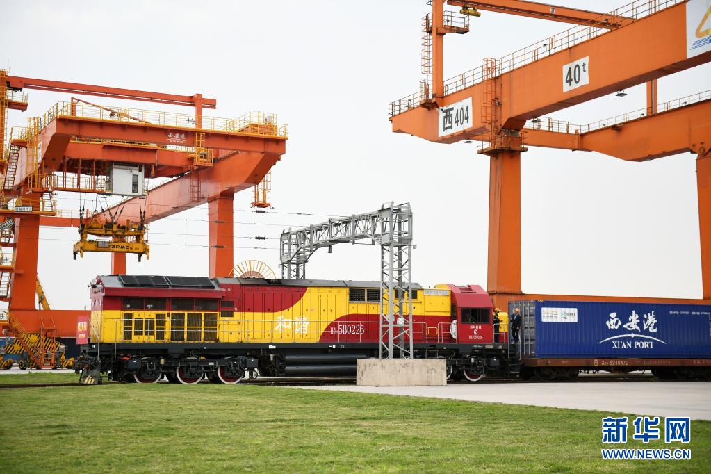 4月13日,X9041次中欧班列(西安)在西安国际港站准备出发开往哈萨克斯坦。新华社记者 李一博 摄