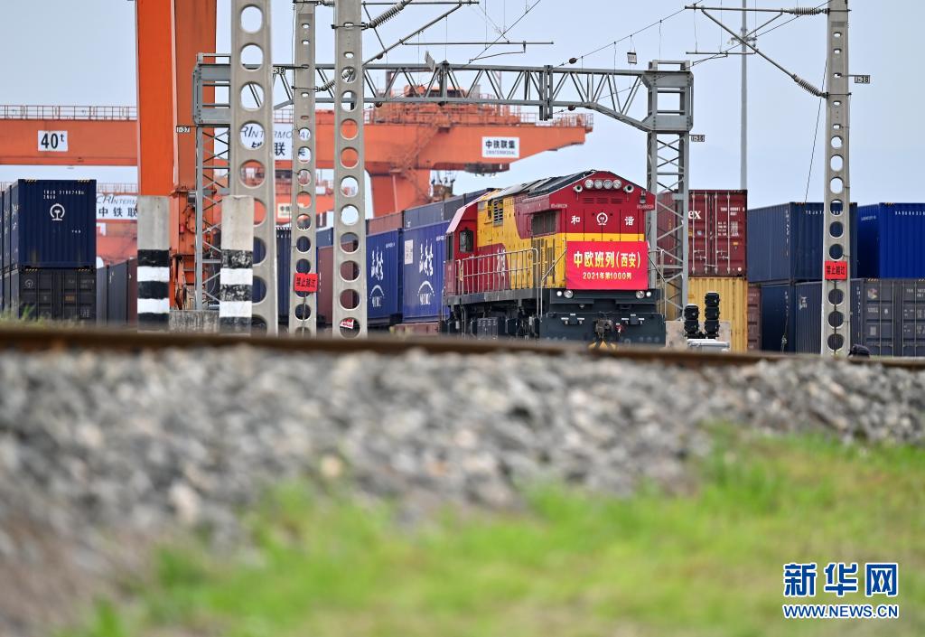 4月13日,X9041次中欧班列(西安)在西安国际港站准备出发开往哈萨克斯坦。新华社记者 李一博 摄