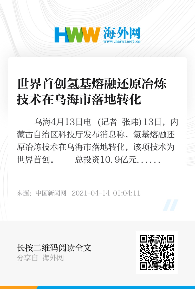 中新网乌海4月13日电 (记者 张玮)13日,内蒙古自治区科技厅发布消息称,氢基熔融还原冶炼技术在乌海市落地转化,该项技术为世界首创。