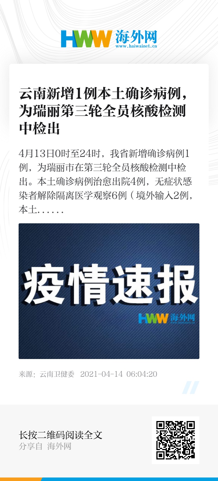 32055905,.云南新增1例本土确诊病例,为瑞丽第三轮全员核酸检测中检出,.2021-04-14 06:36:20,.204483,.胡敏