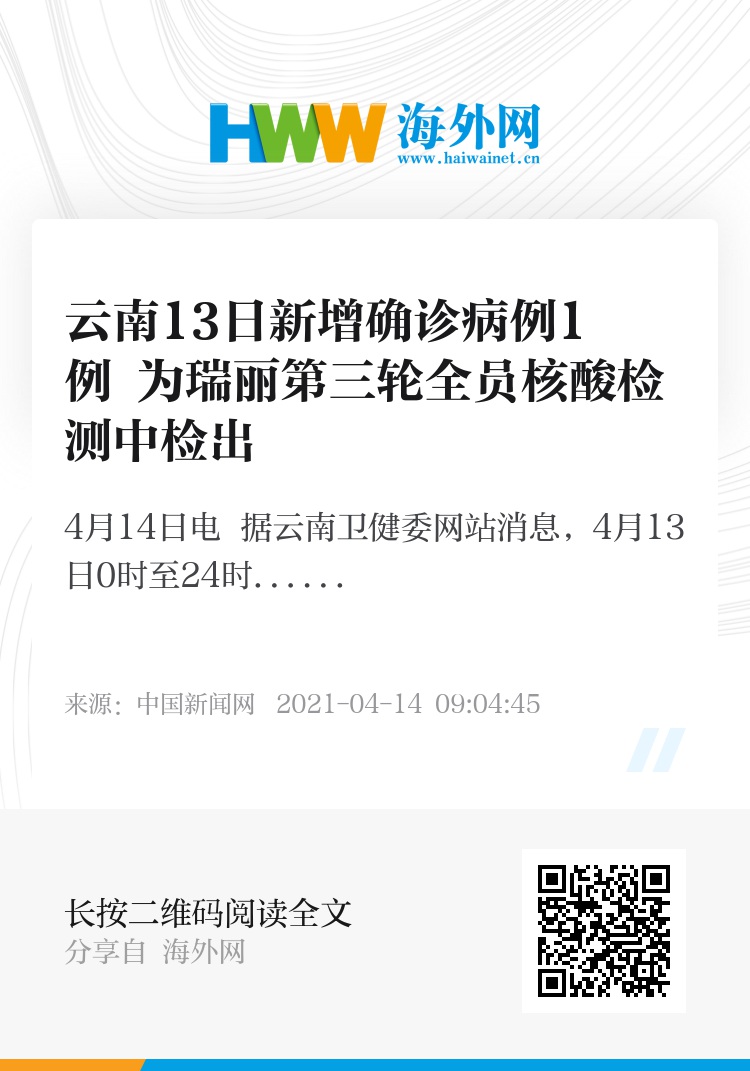 中新网4月14日电 据云南卫健委网站消息,4月13日0时至24时,云南省新增确诊病例1例,为瑞丽市在第三轮全员核酸检测中检出。本土确诊病例治愈出院4例,无症状感染者解除隔离医学观察6例(境外输入2例,本土4例)。