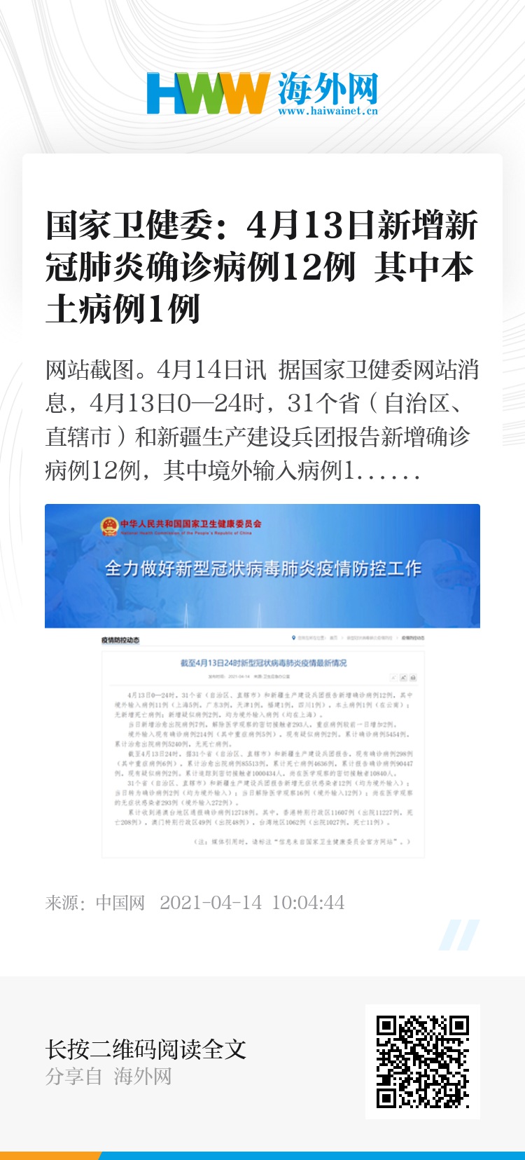 中国网4月14日讯 据国家卫健委网站消息,4月13日0—24时,31个省(自治区、直辖市)和新疆生产建设兵团报告新增确诊病例12例,其中境外输入病例11例(上海5例,广东3例,天津1例,福建1例,四川1例),本土病例1例(在云南);无新增死亡病例;新增疑似病例2例,均为境外输入病例(均在上海)。