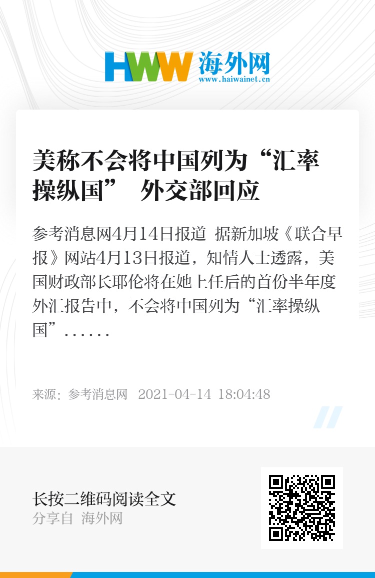 参考消息网4月14日报道 据新加坡《联合早报》网站4月13日报道,知情人士透露,美国财政部长耶伦将在她上任后的首份半年度外汇报告中,不会将中国列为“汇率操纵国”。