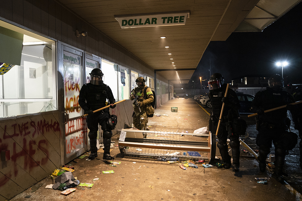 据俄罗斯卫星网报道,美国明尼苏达州一名非裔男子达恩特·赖特11日遭警方枪击身亡后,布鲁克林中心市虽然实施了宵禁,但执法机构工作人员和抗议者之间的冲突已持续两日。图片来源:人民视觉