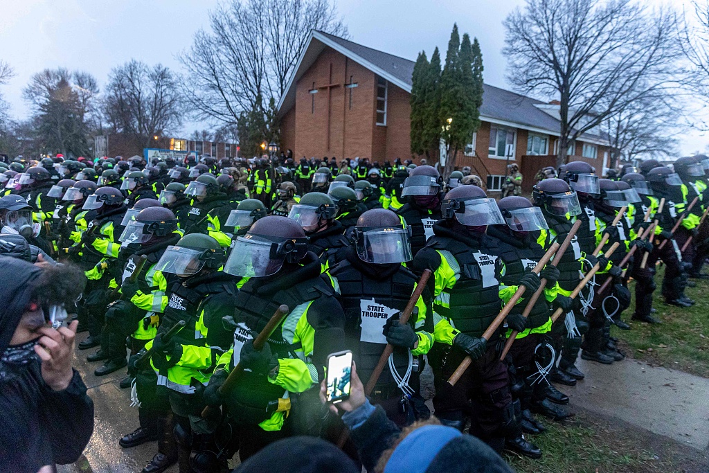 据俄罗斯卫星网报道,美国明尼苏达州一名非裔男子达恩特·赖特11日遭警方枪击身亡后,布鲁克林中心市虽然实施了宵禁,但执法机构工作人员和抗议者之间的冲突已持续两日。图片来源:人民视觉
