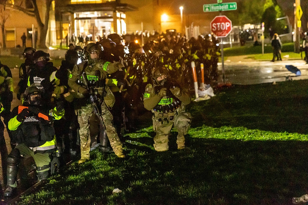 据俄罗斯卫星网报道,美国明尼苏达州一名非裔男子达恩特·赖特11日遭警方枪击身亡后,布鲁克林中心市虽然实施了宵禁,但执法机构工作人员和抗议者之间的冲突已持续两日。图片来源:人民视觉