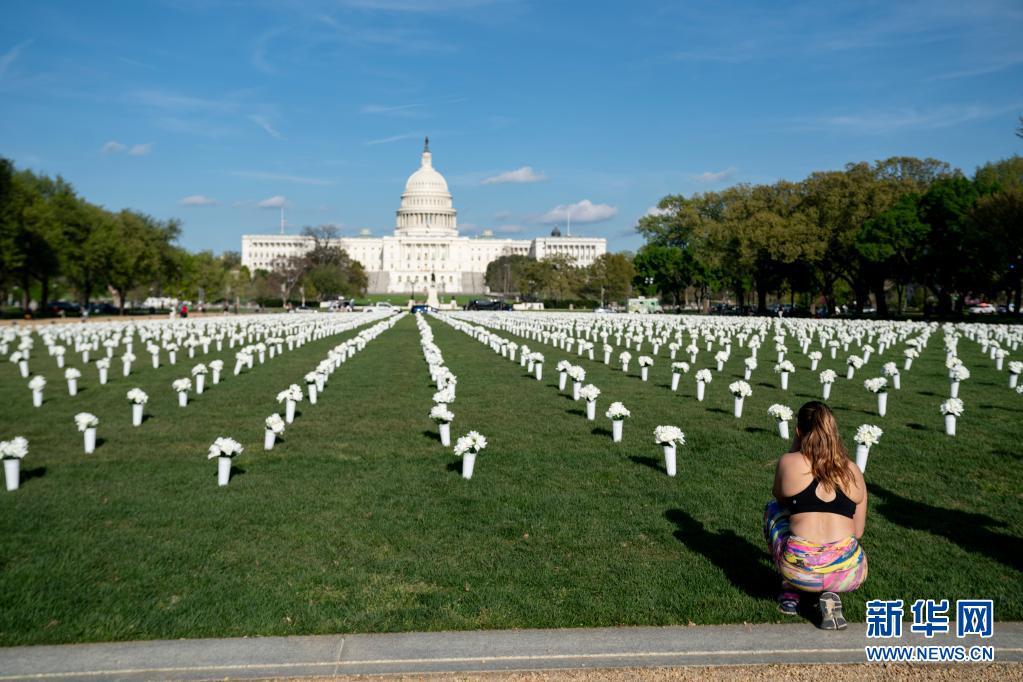 4月13日,一名女子观看美国华盛顿国家广场草坪上摆放的白色绢花。新华社记者 刘杰 摄