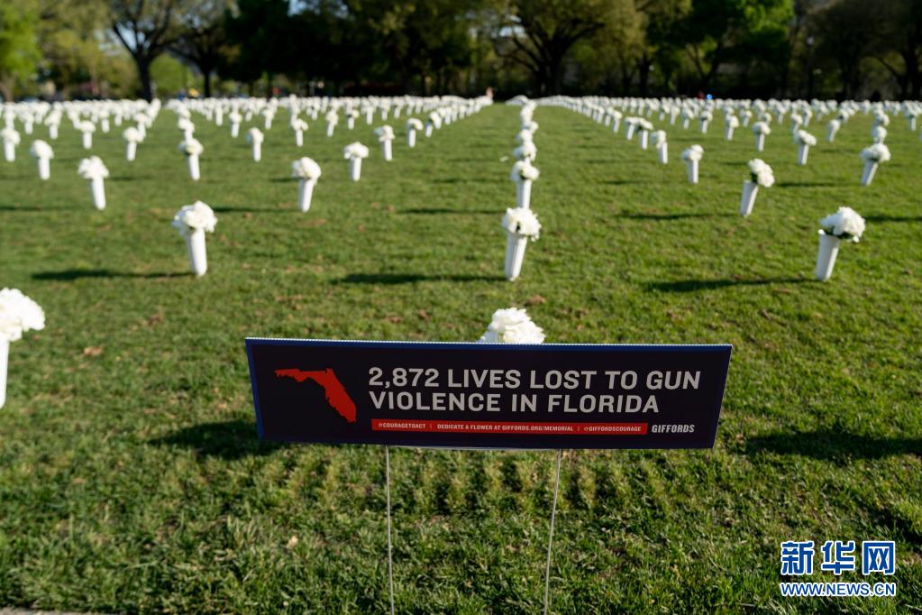 这是4月13日拍摄的美国华盛顿国家广场草坪上摆放的白色绢花。当日,四万朵白色绢花被摆放在国会大厦与华盛顿纪念碑之间的国家广场草坪上,以纪念在全美枪击事件中丧生的人们。据美国媒体报道,2020年美国造成四人及以上伤亡的严重枪击案数量创下历史新高,较2019年激增47%。同时,美国枪支销售数量也突破历史纪录,民众对公共安全担忧加剧。新华社记者 刘杰 摄