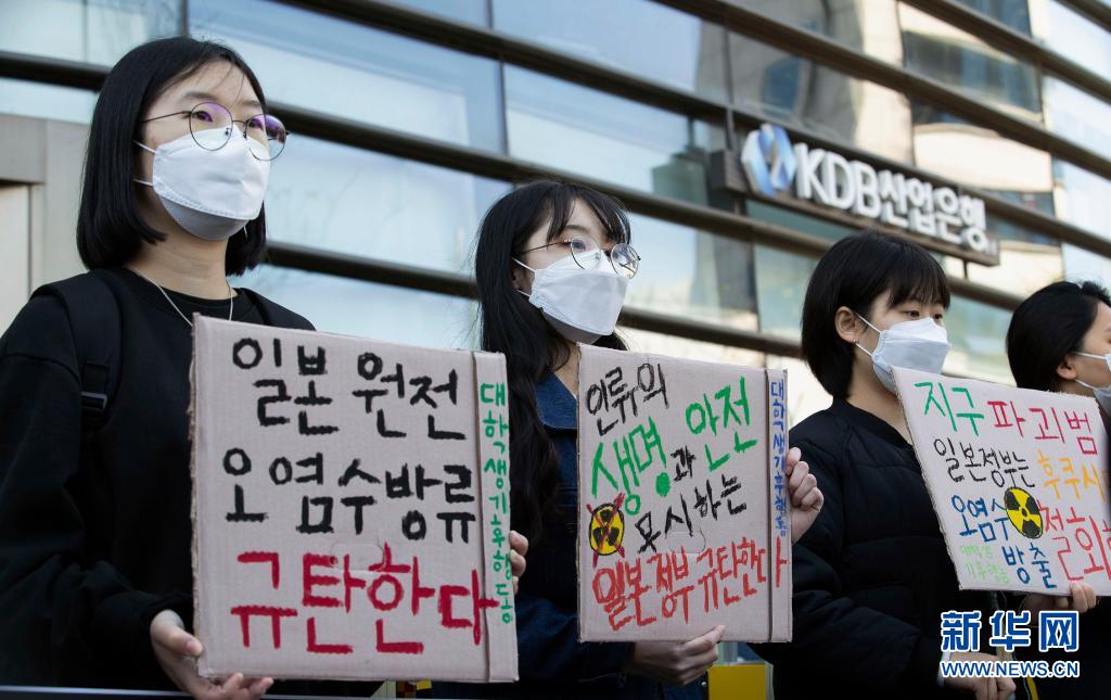 4月14日,韩国民众在位于首尔的日本驻韩国大使馆外集会,抗议日本政府将福岛核废水排入大海。日本政府13日召开有关内阁会议,正式决定将福岛第一核电站上百万吨核废水经过滤并稀释后排入大海,排放将于约2年后开始。新华社发(徐儒锡摄)