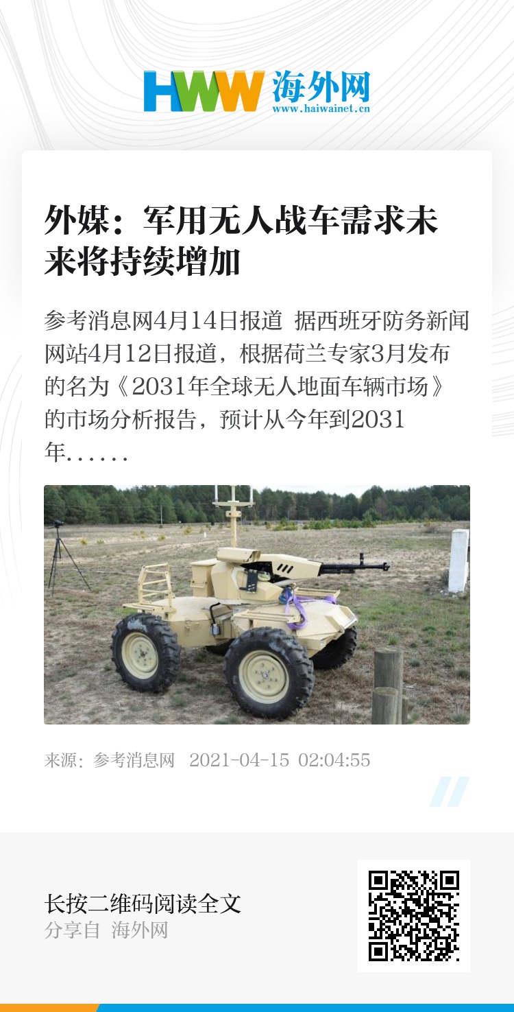参考消息网4月14日报道 据西班牙防务新闻网站4月12日报道,根据荷兰专家3月发布的名为《2031年全球无人地面车辆市场》的市场分析报告,预计从今年到2031年,全球无人驾驶地面车辆(UGV)业务的总价值将增至107亿美元,UGV市场将以年均4.29%的增速发展。