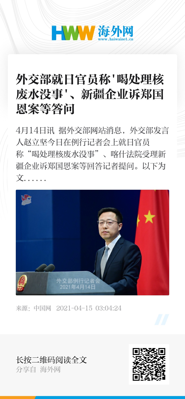 中国网4月14日讯 据外交部网站消息,外交部发言人赵立坚今日在例行记者会上就日官员称“喝处理核废水没事”、喀什法院受理新疆企业诉郑国恩案等回答记者提问。