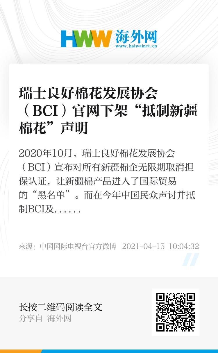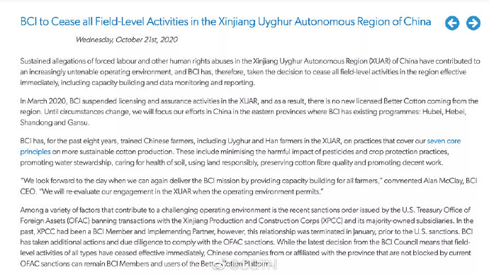 2020年10月,瑞士良好棉花发展协会(BCI)宣布对所有新疆棉企无限期取消担保认证,让新疆棉产品进入了国际贸易的“黑名单”。而在今年中国民众声讨并抵制BCI及H&M等会员品牌后,BCI偷偷下架了这份引起轩然大波的声明...... The Better Cotton Initiative (BCI), a Europe-based organization, announced last year that it was ceasing all operations in northwest China's Xinjiang Uygur Autonomous Region amid accusations of forced labor. The statement has disappeared from the organization's website as backlash grows in China against the organization and its members' attempts to boycott Xinjiang cotton. (Screenshot via BCI website)