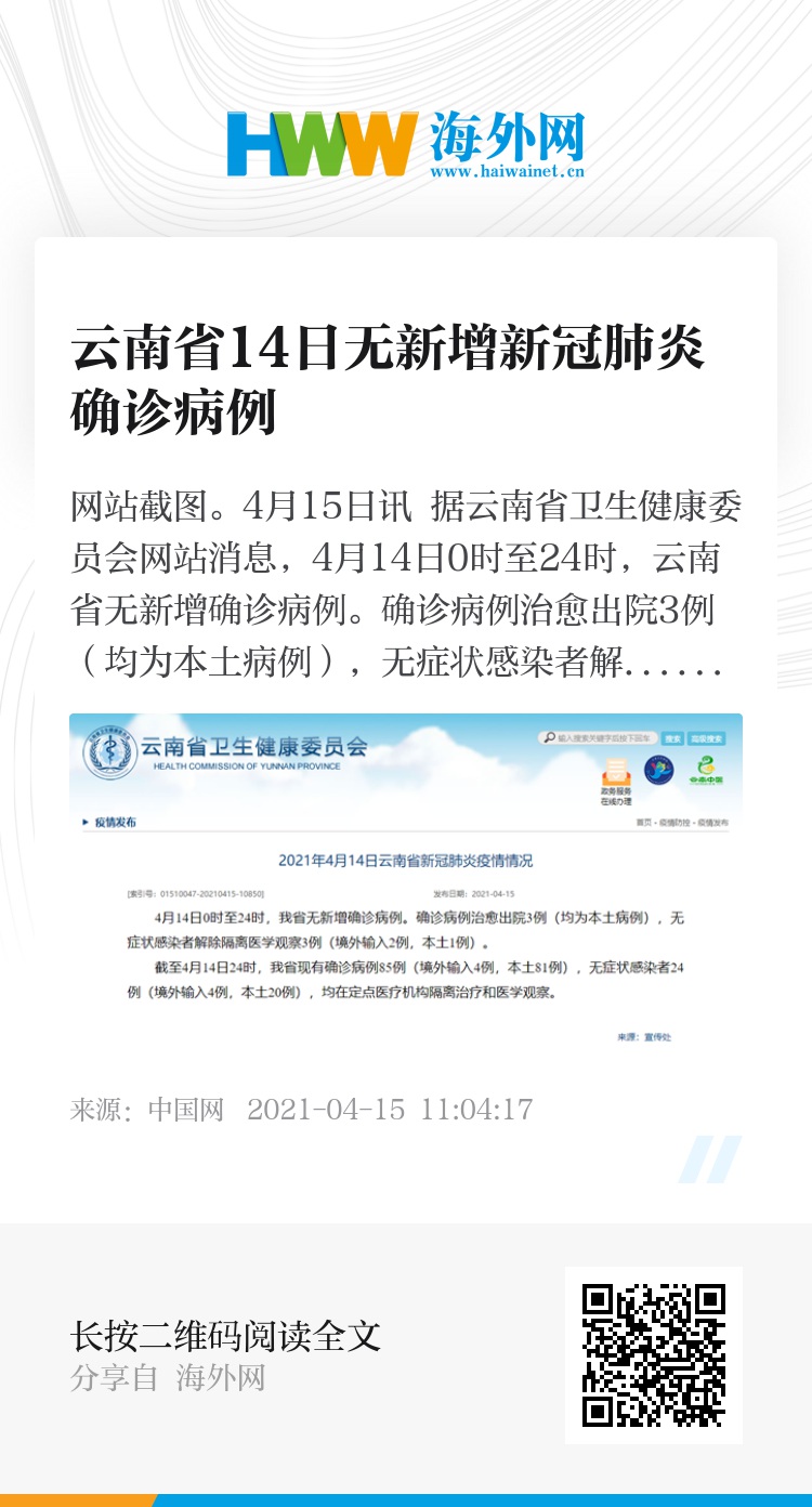 32058155,.云南省14日无新增新冠肺炎确诊病例,.2021-04-15 11:58:17,.3139,.海闻