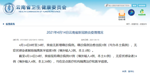 中国网4月15日讯 据云南省卫生健康委员会网站消息,4月14日0时至24时,云南省无新增确诊病例。确诊病例治愈出院3例(均为本土病例),无症状感染者解除隔离医学观察3例(境外输入2例,本土1例)。