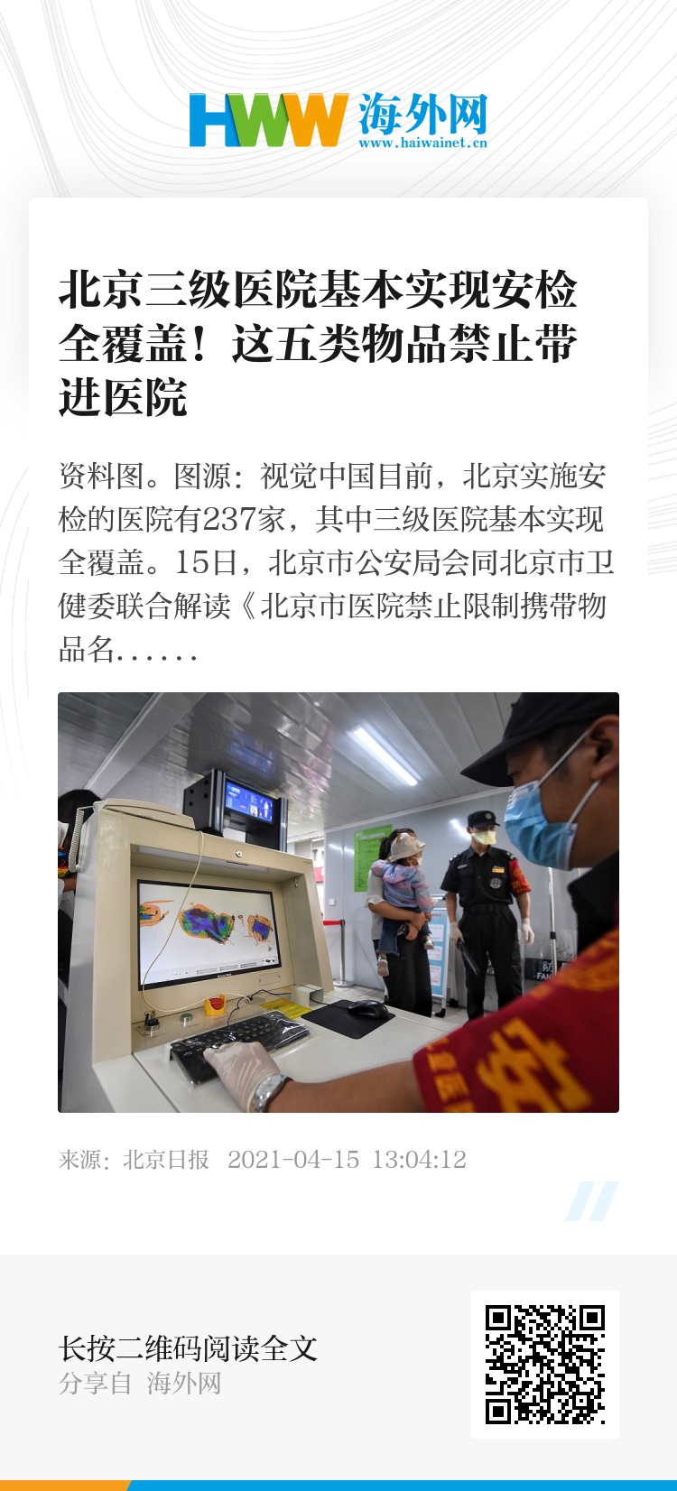 目前,北京实施安检的医院有237家,其中三级医院基本实现全覆盖。15日,北京市公安局会同北京市卫健委联合解读《北京市医院禁止限制携带物品名录》。