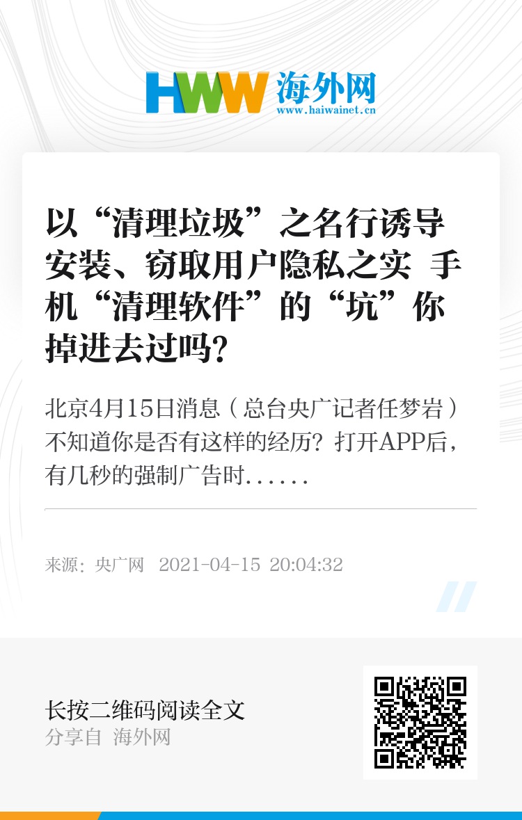 央广网北京4月15日消息(总台央广记者任梦岩)不知道你是否有这样的经历?打开APP后,有几秒的强制广告时间,但这广告像是“安全提示”,警告你的手机“内存不足”“有病毒风险”或者“垃圾太多,亟待清理”,往往还伴随着一个大大的叹号。其实过几秒广告就会自动消失,但如果被这样的信息欺骗点击,就会开始下载所谓的“安全软件”“清理软件”,有的下载之后非但不会安全,还会窃取用户隐私。